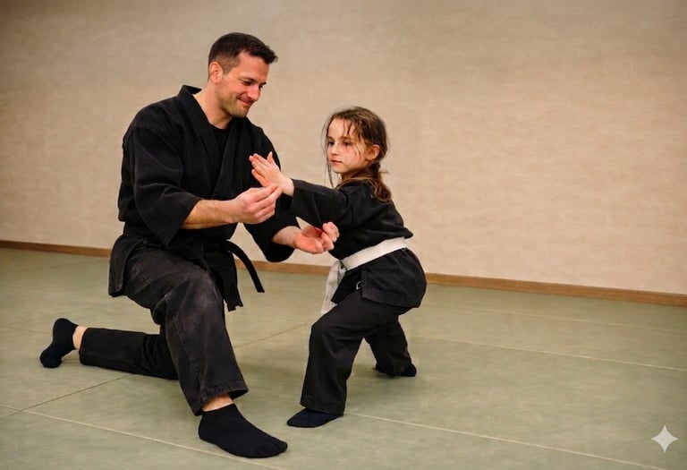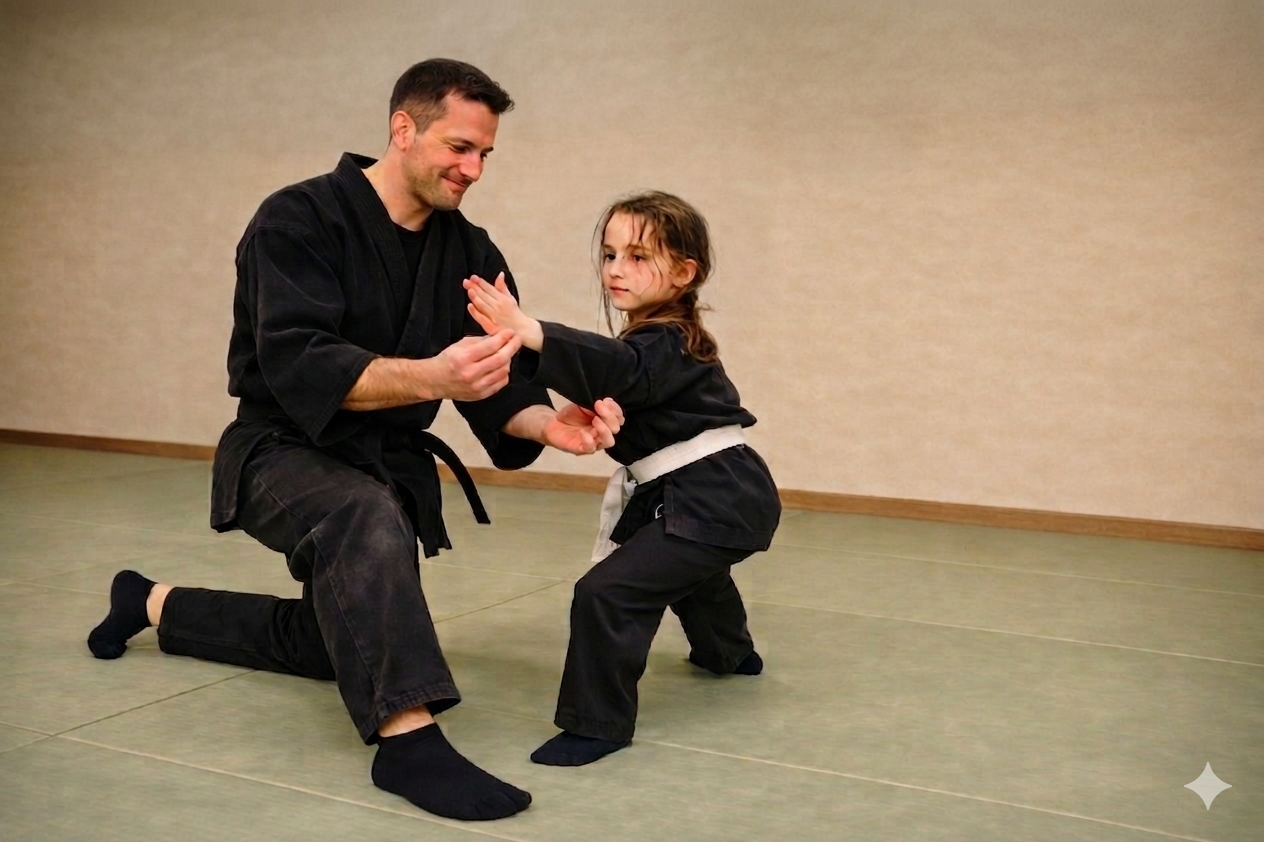 Students learn through cooperative practice, simple drills, and hands‑on guidance from an experienced instructor. The goal is not competition or memorizing long routines — it’s developing real skills step by step.